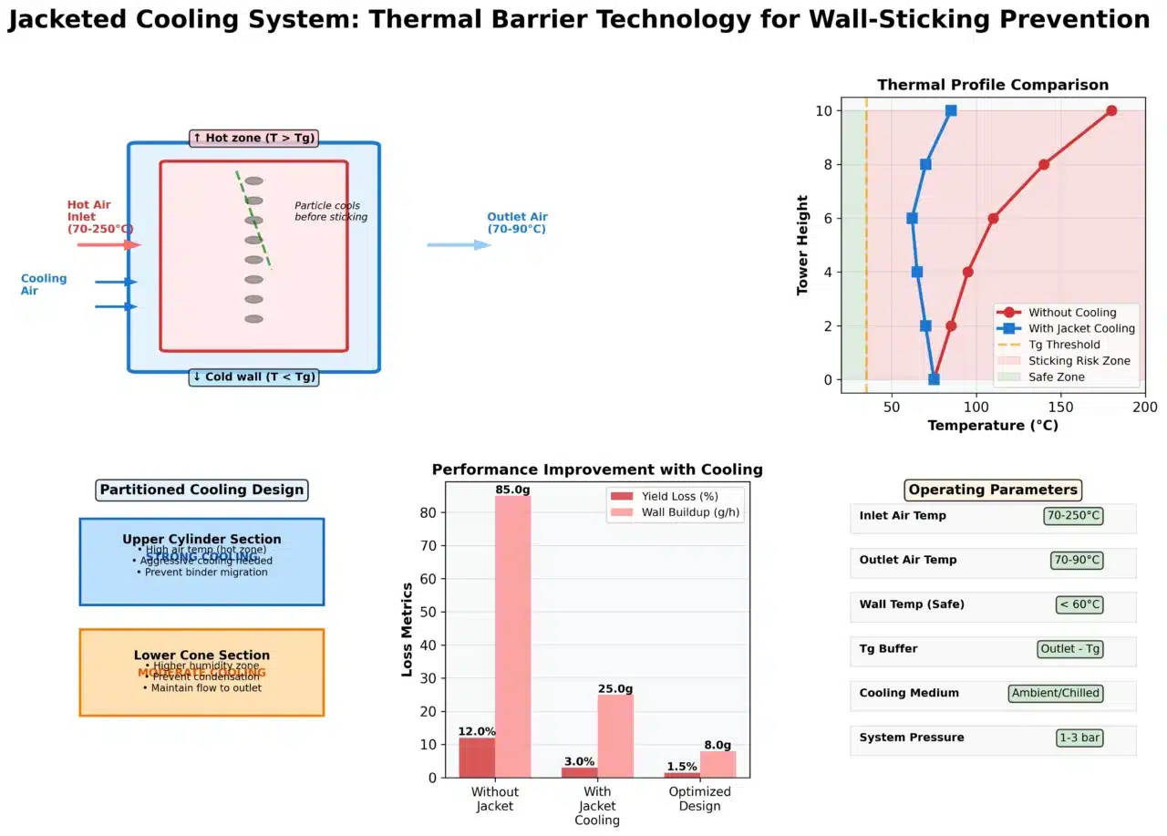 Engineering a jacketed system requires a delicate balance. If the wall temperature drops below the dew point of the humid exhaust air, condensation will occur, leading to “wetting-induced” sticking. Therefore, the cooling system must be partitioned, often providing more intensive cooling in the upper cylinder where the air is hotter, and moderate cooling in the lower cone where humidity is higher.