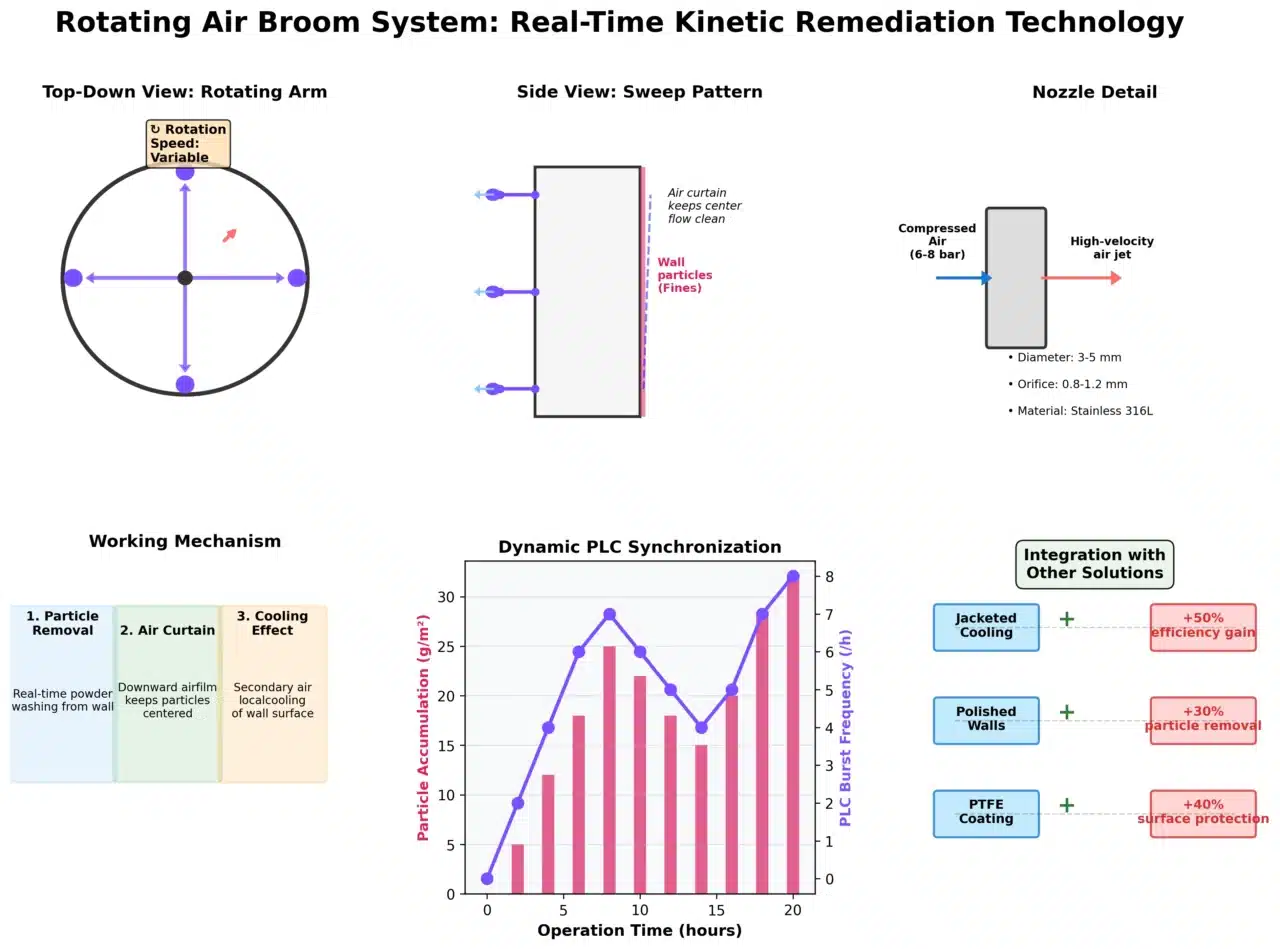 Despite optimized geometry and thermal barriers, the accumulation of “fines”—extremely small particles that are easily trapped in the slow-moving air boundary layer near the wall—remains a risk. Over time, these fines can form a thin layer that acts as an insulator, eventually leading to localized overheating and product scorching.The “Air Broom” or “Air Sweep” device is the mechanical solution to this challenge. This system consists of a rotating arm equipped with a row of high-pressure nozzles that follow the internal circumference of the tower. At SINOTHERMO, these systems use compressed air (typically 6 to 8 bar) to create a high-velocity air curtain that “sweeps” the wall surface.