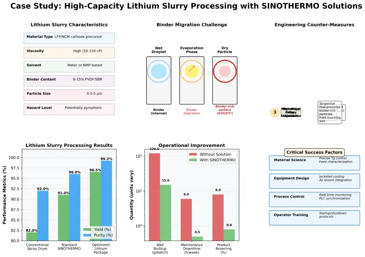 Observations in high-capacity lithium slurry mixing suggest that “yield loss” in consecutive batches is often caused by the accumulation of binder-rich fines on the tower walls. As the water or solvent evaporates, the binder (such as PVDF or SBR) tends to migrate to the surface of the droplet, making it inherently stickier than the bulk material. If these binder-rich particles stick to the wall, they can degrade, changing the chemical composition of the final product and reducing the battery’s electrochemical performance.